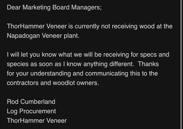 Please find attached the new ThorHammer prices and specs for veneer logs. To simplify specs for slasher and harvester operators, our spec is now 10" top and 9 foot log - much easier to remember. We can and will still take a 9" log, but 7's and 8's will be scaled and sorted as sawlogs or firewood and paid accordingly as a grade 4 log.